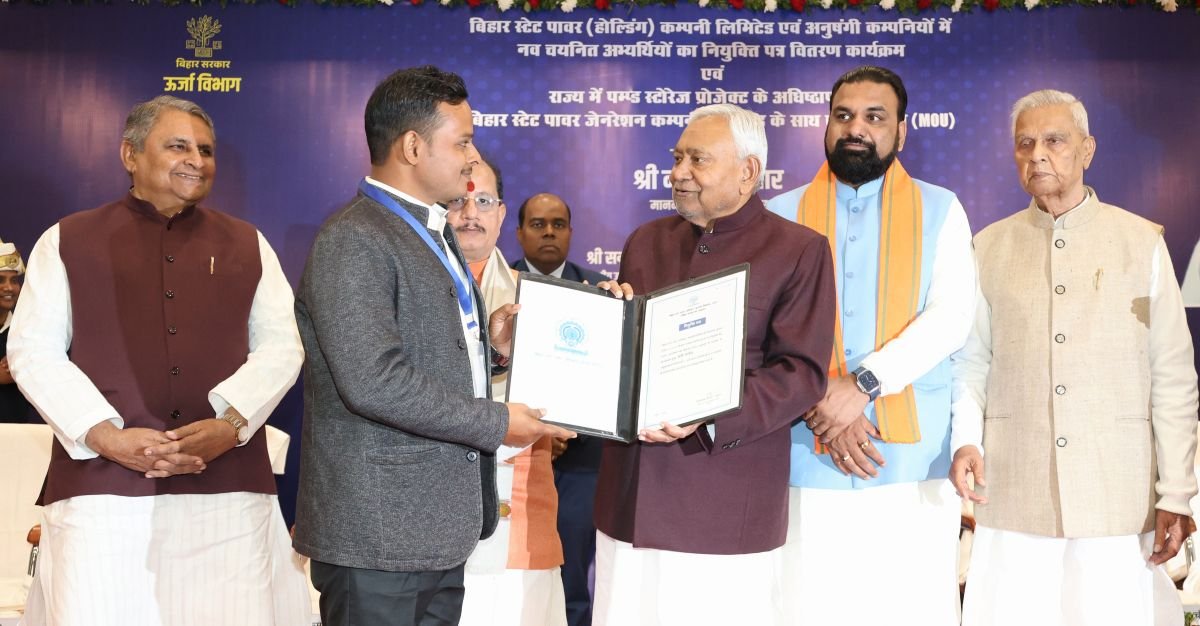 पटना, 16 दिसंबर 2025: मुख्यमंत्री श्री नीतीश कुमार ने विद्युत भवन में आयोजित कार्यक्रम में ऊर्जा विभाग के अंतर्गत बिहार स्टेट पावर (होल्डिंग) कंपनी लिमिटेड एवं इसकी अनुषंगी कंपनियों में चयनित 2390 अभ्यर्थियों को नियुक्ति पत्र प्रदान किए। इनमें 1810 तकनीशियन, 512 पत्राचार लिपिक एवं 68 भंडार सहायक शामिल हैं। मुख्यमंत्री ने प्रतीकात्मक रूप से तीन अभ्यर्थियों को नियुक्ति पत्र सौंपते हुए सभी चयनित युवाओं को बधाई दी और पूरी निष्ठा से कार्य करने का आह्वान किया।